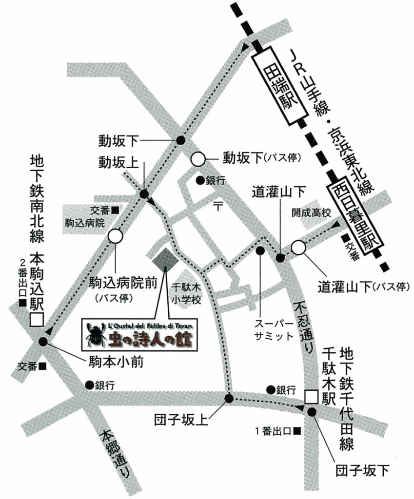 - 東京メトロ千代田線「千駄木駅」1番出口より(団子坂上を右折)徒歩12分