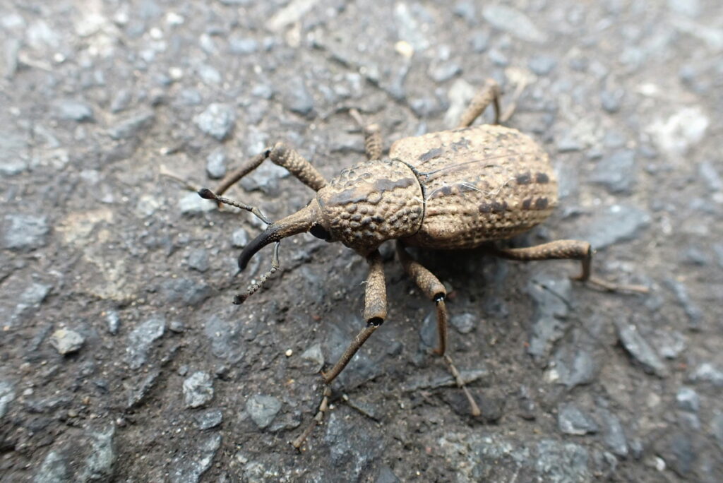 100メートルほど進むと景色が開けて、谷の向こうが見えた・・と思ったとき、足元にオオゾウムシが。